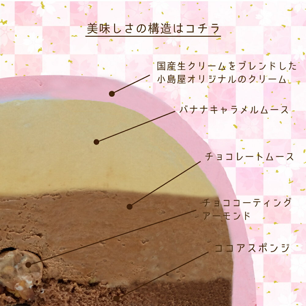 お子様でも召し上がれるようバナナキャラメルムースとチョコレートムースを二層仕立てに、ムース底にはカリカリ食感が楽しめるチョココーティングアーモンドをアクセントに仕上げました。